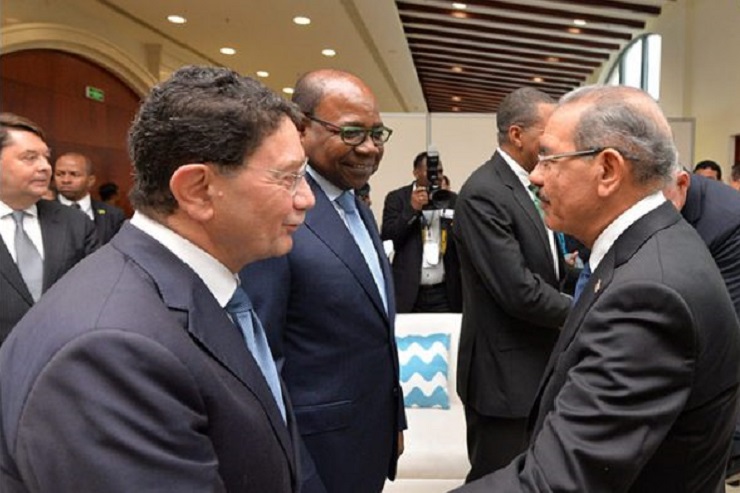 TOURISM MINISTER EDMUND BARTLETT (CENTRE), LOOKS ON AS SECRETARY GENERAL OF THE UNITED NATIONS WORLD TOURISM ORGANISATION (UNWTO) DR. TALEB RIFAI (LEFT) GREETS PRESIDENT OF THE DOMINICAN REPUBLIC DANILO MEDINA SÁNCHEZ AT THE UNWTO GLOBAL CONFERENCE. (PHOTO: JIS)