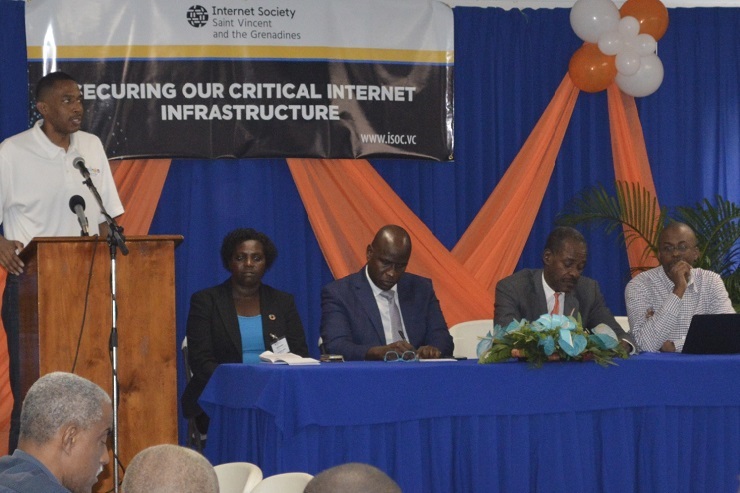 STEPHEN LEE, PROGRAMME DIRECTOR OF CARIBNOG, DELIVERS REMARKS AT THE FORMAL OPENING OF THE ST VINCENT AND THE GRENADINES NATIONAL CYBER SECURITY SYMPOSIUM. SEATED AT THE HEAD TABLE, FROM LEFT, ARE: ROXANNE JOHN, PRESIDENT OF THE INTERNET SOCIETY ST VINCENT CHAPTER; SHERNON OSEPA, MANAGER OF REGIONAL AFFAIRS FOR LATIN AMERICA AND THE CARIBBEAN, INTERNET SOCIETY; JERROL THOMPSON, DIRECTOR OF SPECIAL PROJECTS IN THE OFFICE OF THE PRIME MINISTER; AND BEVIL WOODING, CARIBBEAN OUTREACH LIAISON, ARIN.